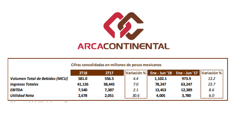Arca Continental, S.A.B. de C.V. (BMV: AC*) (“Arca Continental” o “AC”), el segundo embotellador más grande de Coca-Cola en América Latina, anunció sus resultados para el segundo trimestre. Ventas netas incrementaron 7.0% con respecto al 2T17, a Ps. 41,126 millones. EBITDA alcanzó Ps. 7,540 millones con un margen de 18.3%, un aumento de 2.1% respecto al mismo trimestre del año pasado. Utilidad Neta aumentó 30.6% a Ps. 2,678 millones con un margen de 6.5%.