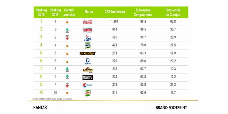 “En el ranking a nivel nacional podemos observar que Cola-Cola sigue siendo el líder dentro de las marcas más elegidas en México, seguido de Bimbo, Lala, Nutrileche, La Moderna, Alpura, La Costeña, Nescafé, Pepsi y Knorr. Se observa que dentro del Top 10, seis marcas de origen mexicano y por primera vez hay un movimiento en el Top 3, Bimbo subió a la segunda posición de este listado. De igual forma se observa que los productos relacionados con alimentos, bebidas y lácteos fueron los que más hogares compraron y con mayor frecuencia el año pasado”, explicó Fabián Ghirardelly, Country Manager de Worldpanel Division de Kantar México.