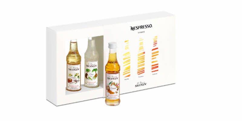 La marca se unió a Monin, reconocida firma francesa dedicada a la fabricación de syrups, para elaborar tres variedades de sabores tentadores para realizar recetas de café gourmet. Los tres sabores que presenta el kit de Nespresso Syrup Monin limited edition son Caramelo, Coco y Vainilla. Esta propuesta acerca a los amantes de esta bebida, la posibilidad de crear diferentes recetas de café con leche como un verdadero barista.
