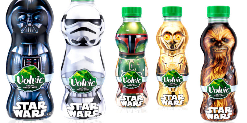 Volvic ha colaborado con Disney en Reino Unido para crear una serie de botellas de Star Wars para colección, de edición limitada en el agua mineral, con los diseños de los personajes de Star Wars. Las botellas de agua Volvic están diseñados para hacer el agua más divertida para las familias. Las botellas están disponibles en cinco personajes, Chewbacca, Stormtrooper, Darth Vader, C-3PO y Boba Fett.